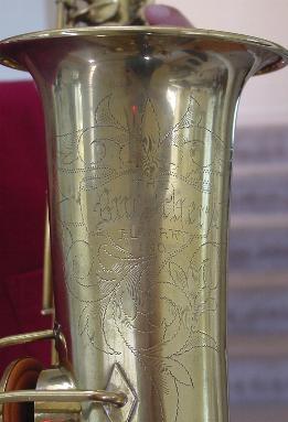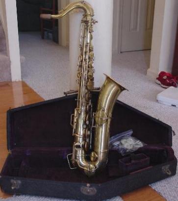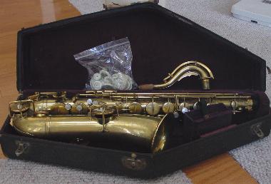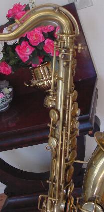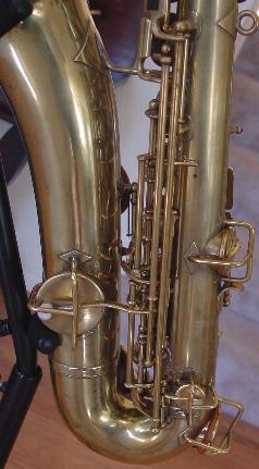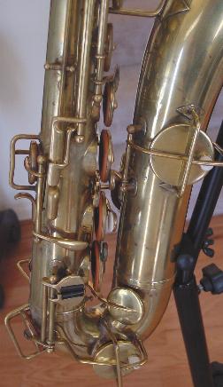 This horn was torn down, cleaned out, body and keys polished, body and keys separately treated with a powerful anti tarnish substance (better than a clear lacquer as it is transparent and non inhibiting sound-wise and doesn't peel or flake off with age), then rebuilt replacing all its original white pads with new brown leather snap pads. I even saved the original white pads that were replaced in a clear plastic bag for the new owner to see. Many of the original white snap pads were still functional! Since these original pads would not have held up very well in the future and would tend to leak quickly, I decided to change them all out anyway, but save them as a novelty and keepsake.