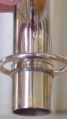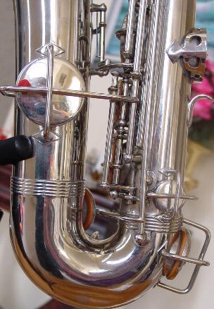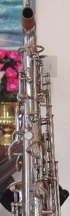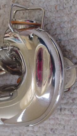 Cosmetically this horn is in gorgeous original condition. There is really only one significant flaw a shallow dent at the bow that's about two inches long and half and inch wide and that's about it. I considered having it taken out which isn't a significantly difficult or expensive option, but was unsure of what the process might do to the chrome finish in that area. Also the dent is in a very inconspicous out of the way place and isn't obvious unless you are looking right at the inside chair side of the bow. It doesn't intrude into the body more then around a quarter of an inch, if that much. I decided to leave the decision to the new owner. There are two good closeup pictures of the dent. The keys and thumbrests show no discernable wear and the pearls look essentially new and shiny. It's even very nice on the valve covers, around the tone holes, and under the keys. The chrome/nickle plate finish is intact in the 99% range, among the best I've seen in a horn this old.