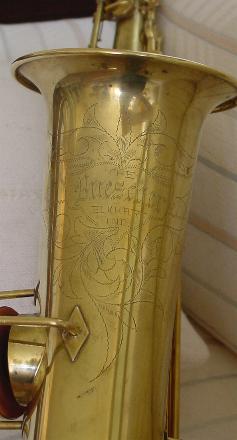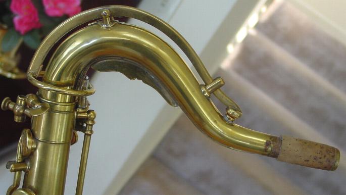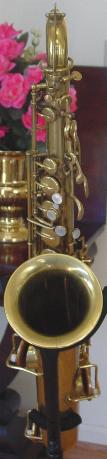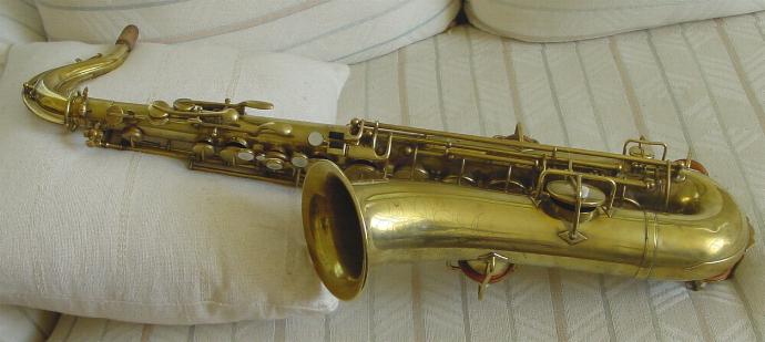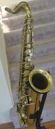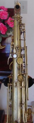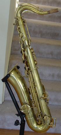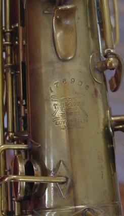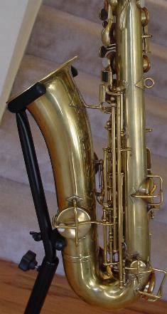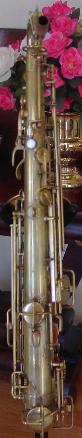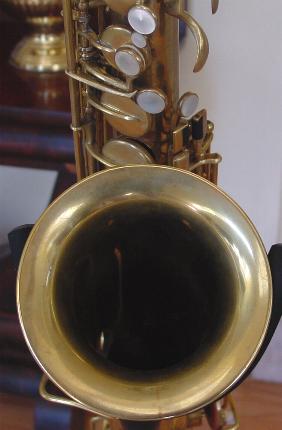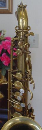 This horn was torn down, cleaned out, body and keys polished, body and keys separately treated with a powerful anti tarnish substance (better than a clear lacquer as it is transparent and non inhibiting sound-wise and doesn't peel or flake off with age), then rebuilt replacing all its original white pads with new brown leather snap pads. I even saved the original white pads that were replaced in a clear plastic bag for the new owner to see. Many of the original white snap pads were still functional! Since these original pads would not have held up very well in the future and would tend to leak quickly, I decided to change them all out anyway, but save them as a novelty and keepsake.