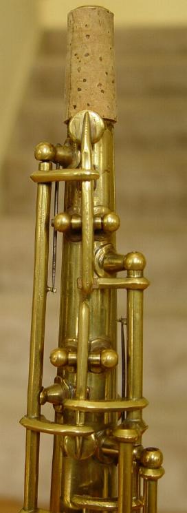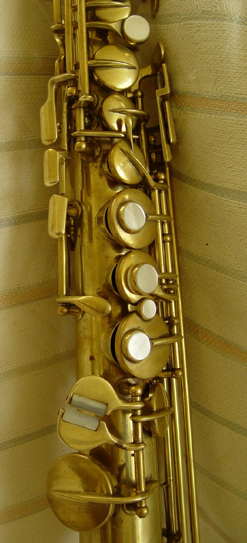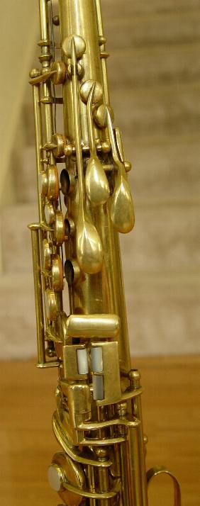 Cosmetically, I see no significant dents or scratches on the body. There is one micro ding near the low C sharp and another even smaller near the low B and B flat holes. There is another micro ding up at the top near the cork. None of these are obvious and take careful examination to find. There are some typical finish imperfections under some of the keys and around some tone holes. There is no visible wear showing on any of the keys or thumbrests with one minor exception. There is some barely visible, if you're looking, underlying silver showing through on the very bottom of the octave key. Original gold plate finish is intact in the 97% range which is phenomenal in an original finish this old.