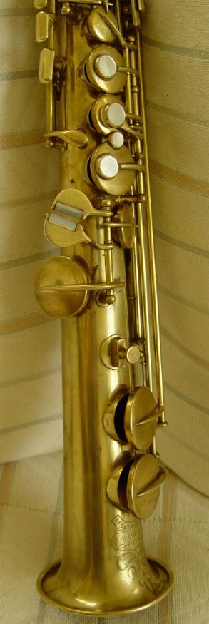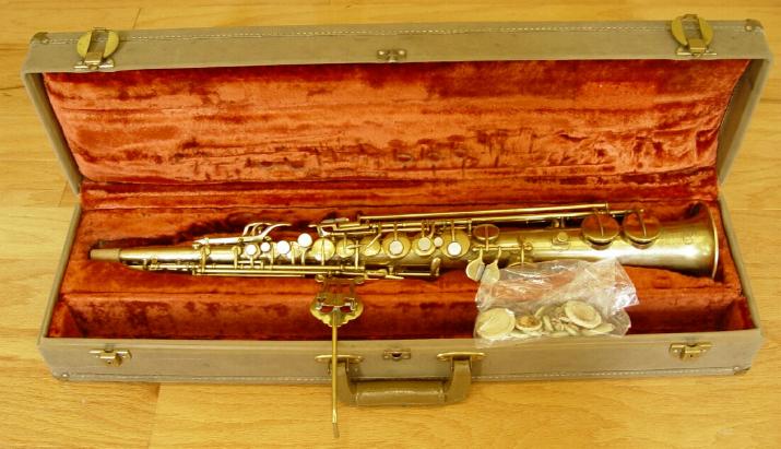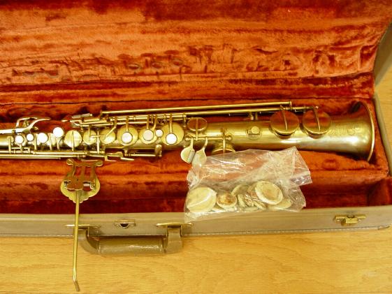 This horn was torn down, cleaned out, body and keys polished, body and keys separately treated with a powerful anti tarnish substance (better than a clear lacquer as it is transparent and non inhibiting sound-wise and doesn't peel or flake off with age), then all corks and pads replaced. This sax had most all its original white pads still on it prior to the repad and they are saved in a clear plastic bag inside the case as a keepsake. The new pads are flat washer metal resonator style similar to the Conn reso pads Conn used later after this timeframe. This horn is partially through break in, but may need more regular playing by its new owner to complete that.