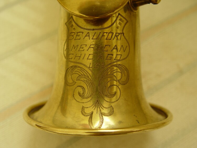 This finish was more challenging to determine due to the excellent condition. The engraving in both the serial number area and the bell are deep and quite crisp as you can see from the pictures. This clearly establishes that the finish must be either bare brass or gold plate. The tone of the instrument is very refined and smooth like gold, not at all ragged and raw like with bare brass. Also the one very light wear spot on the octave key is beginning to show through to the underlying silver, another strong indicator that it's a gold plate finish. So I believe this to be a gold plate instrument and I have restored dozens of these before so I have experience with them.