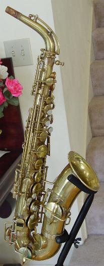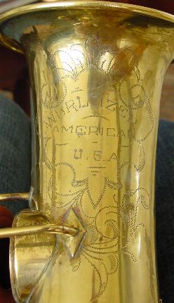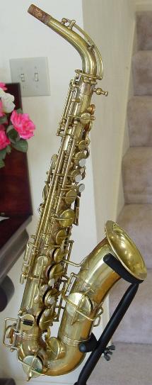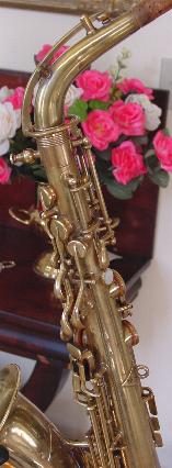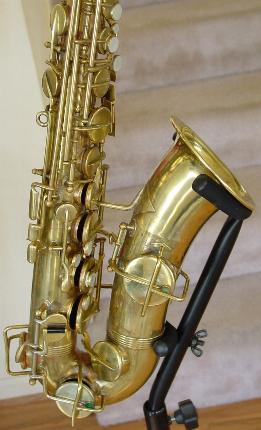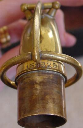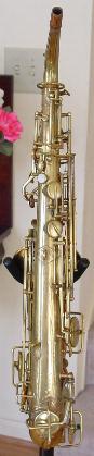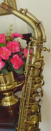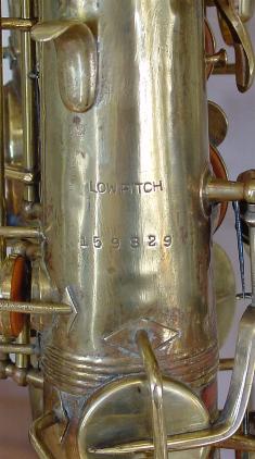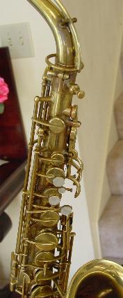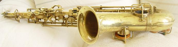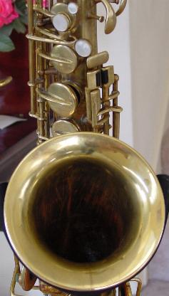 There are no dents that I can see. There is a tiny ding on the back of the bell near the brace. Another on the bell rim, and some rippling here and there in the bow area and below the serial number where perhaps some dings were once removed. There is also a slight stress line just above the low B flat bell tone hole. It's not all that noticable unless you look right at it and it probably could be removed though it seems too minor to bother. I don't think its quite prominent enough to be visible in the pictures. I see little or no signs of player wear on any of the keys or thumbrests. There are no obvious major resolder repairs or signs of work on any of the keyguards or posts anywhere that I can see. There is some general gold plate finish deterioration here and there over the horn that one might expect from the number of years involved and play wear. This is not overly obvious unless you are close up and it perhaps gives it a classic vintage look that's far superior, to the Selmer vintage finish available on their new models. Original gold plate finish is intact in about the 90% range or better.