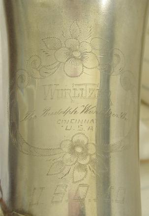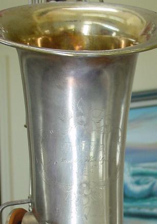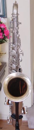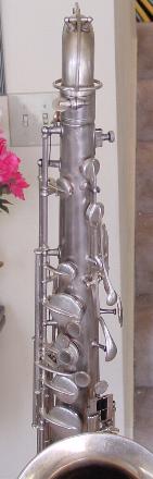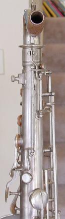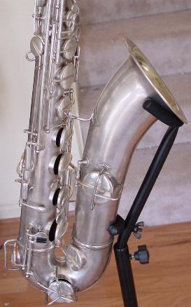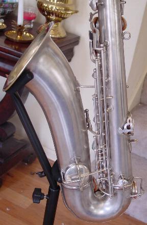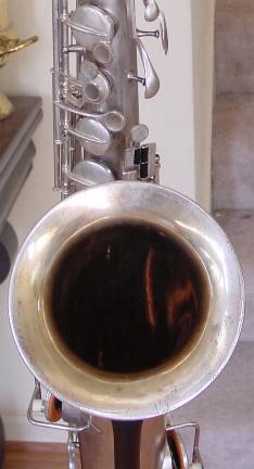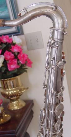Cosmetically it truly is gorgeous as you can see, especially for its age. It looks almost as good as it plays. It's obviously the original silver neck with a new neck cork just applied. There is some minor finish loss and some neck pull down bulging that is common in older horns. There is some typical loss of finish and wear on a number of keys and key cups. The finish loss on five or six of the key cups where the finish is starting to peel off is a result of classic Conn manufacturing process defects I have seen on other Conn silverplate saxes and not the result of wear. There is almost no typical loss underneath the keys and around the tone holes that you typically see. The finish loss isn't that visible unless you are looking more closely. There are no significant dents though there are some dings in the front side of the bottom of the bow, one larger on the guard and two fairly small ones nearby. There is a very little typical scratching and loss of finish above the ring area. There is a little scuffed place at the top of the body near the neck join. Amazingly there are no resoldered posts or keyguards that I can see, and I looked twice because that's so rare on such an old horn. There is gold wash in the bell though after so many years it isn't quite as prominent anymore as it probably once was. Original silver plate is intact in the 95% range, phenomenal for a horn this old! Look at the pictures and see for yourself.